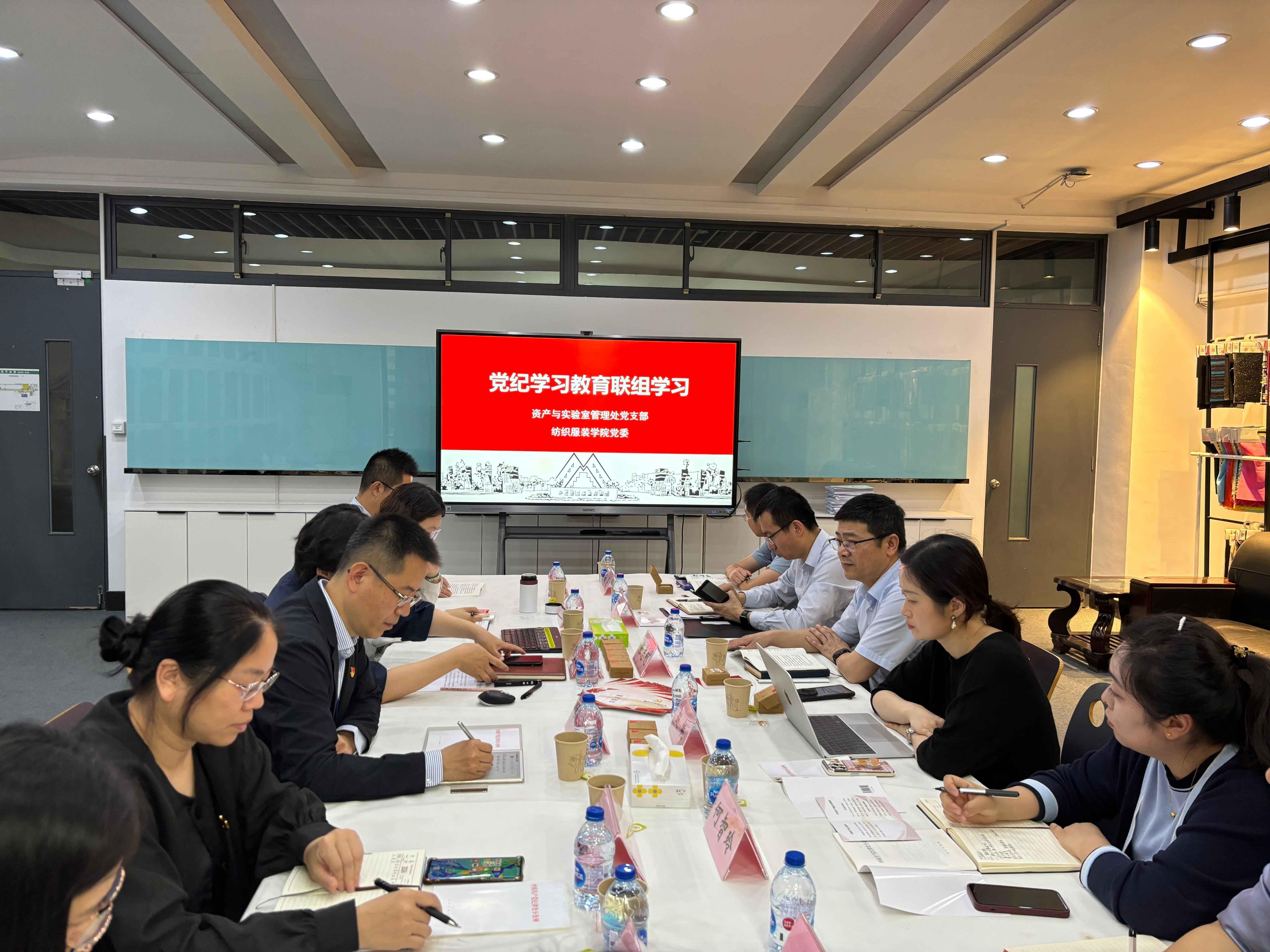 为深化党纪学习教育,凝聚发展合力,激励担当作为,6月5日上午,ok138cn太阳集团529党委和资产与实验管理处党支部开展党纪学习教育专题联组学习。资产与实验室管理处处长、资实处党支部书记张志刚、资产与实验室管理处副处长赵桃、资产与实验室管理处副处长张敏及5名业务科长、纺织学院全体领导班子、各系室主任、实验室教师参加学习,ok138cn太阳集团529院长辛斌杰主持会议。