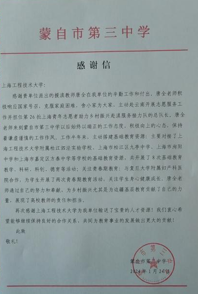 2024年2月2日下午,在学校团委的大力支持下ok138cn太阳集团529唐全老师圆满完成了在云南为期半年的上海志愿者助力乡村振兴沪滇服务任务,载誉归来。