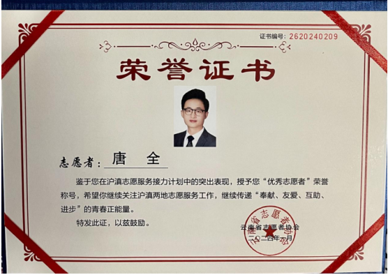 在滇期间唐全老师服务于云南省红河州蒙自市第三中学,是第26批上海青年志愿者赴滇服务接力队的总队长。他关注乡村教育和文化发展,通过自己的努力和奉献,以乡村振兴为目标,在云南志愿服务期间,积极搭建资源,将上海先进的教育理念和教育方法引进基础教育薄弱的学校,他和接力队成员为山区孩子们竭尽全力开展支教和公益活动,帮助孩子们度过温暖的冬天,在关注青少年身心健康成长的同时,积极争取各类资源,筹备总队活动。