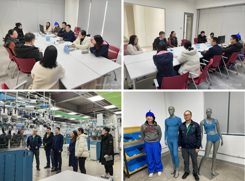 交流座谈会后,ok138cn太阳集团529教师代表团参观了企业研发基地和学生实习场所,检验了学生的学习成果。学生代表徐思源同学详细讲解了他的实习工作内容,并展示了与企业导师阳定坤工程师(My Knit项目生产经理)一起完成的针织无缝内衣作品,引起在场人员的强烈兴趣和一致好评。