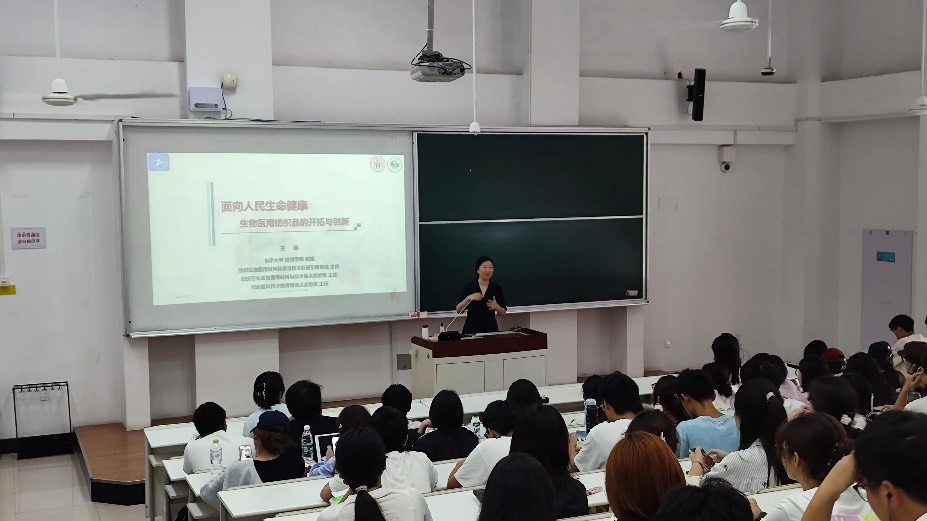 东华大学纺织学院王璐教授则以“面向人民生命健康:生物医用纺织品的开拓与创新”为主题,向学生们介绍了生物医用纺织品的研究现状及未来发展方向。王教授的讲解引发了学生们的热烈讨论,大家对于生物医用纺织品的应用前景表示了浓厚的兴趣。