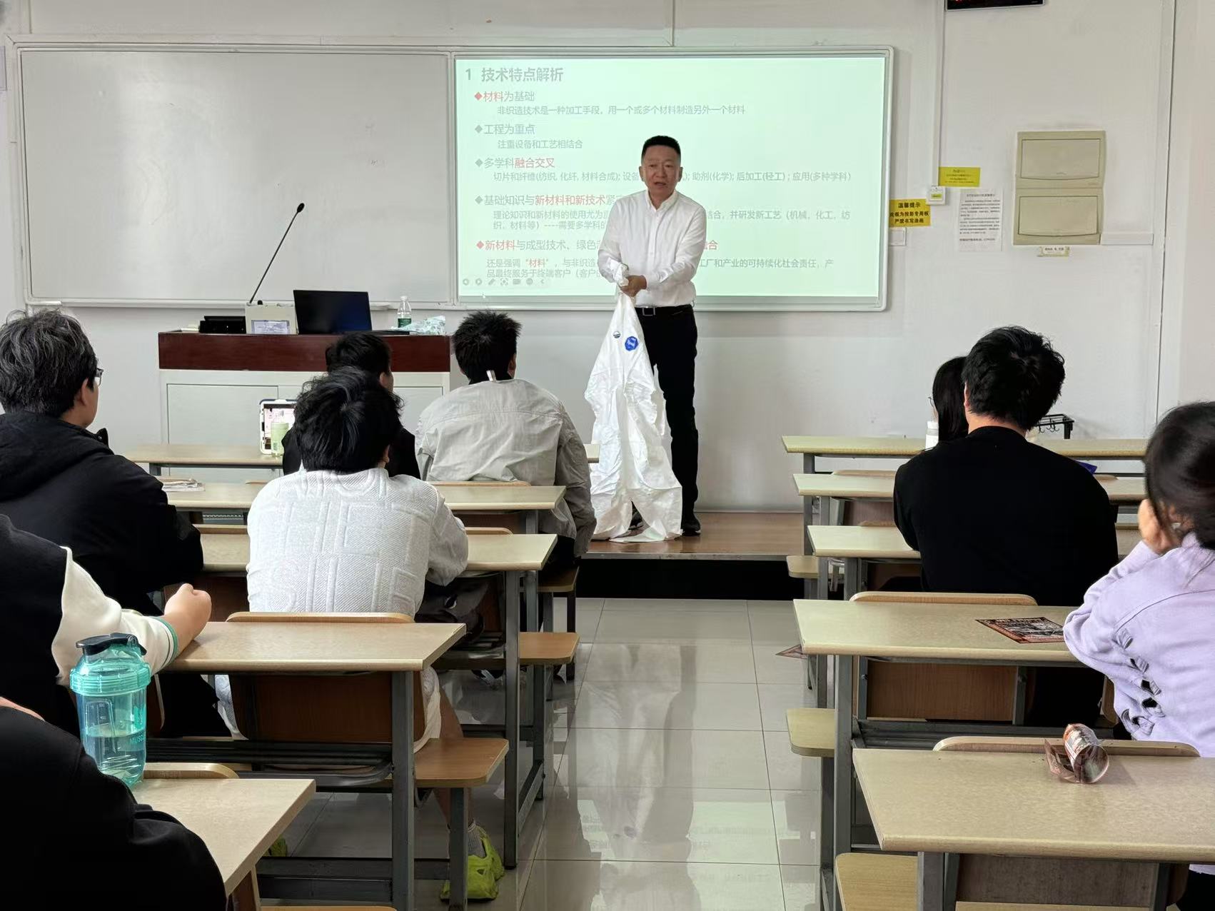 符博士通过展示各类非织造样品,深入浅出地向学生们介绍了非织造产品的加工工艺、产品应用以及非织造产业未来的发展趋势。他的讲解不仅涵盖了理论知识,还结合了实际案例,使学生们对非织造材料有了更直观和深入的理解。在授课过程中,符博士还分享了自己在企业中的经验,为即将进行顶岗实习的学生们提供了宝贵的建议。他强调了理论与实践相结合的重要性,并鼓励学生们在实习期间积极学习、勇于探索,为未来的职业生涯打下坚实的基础。