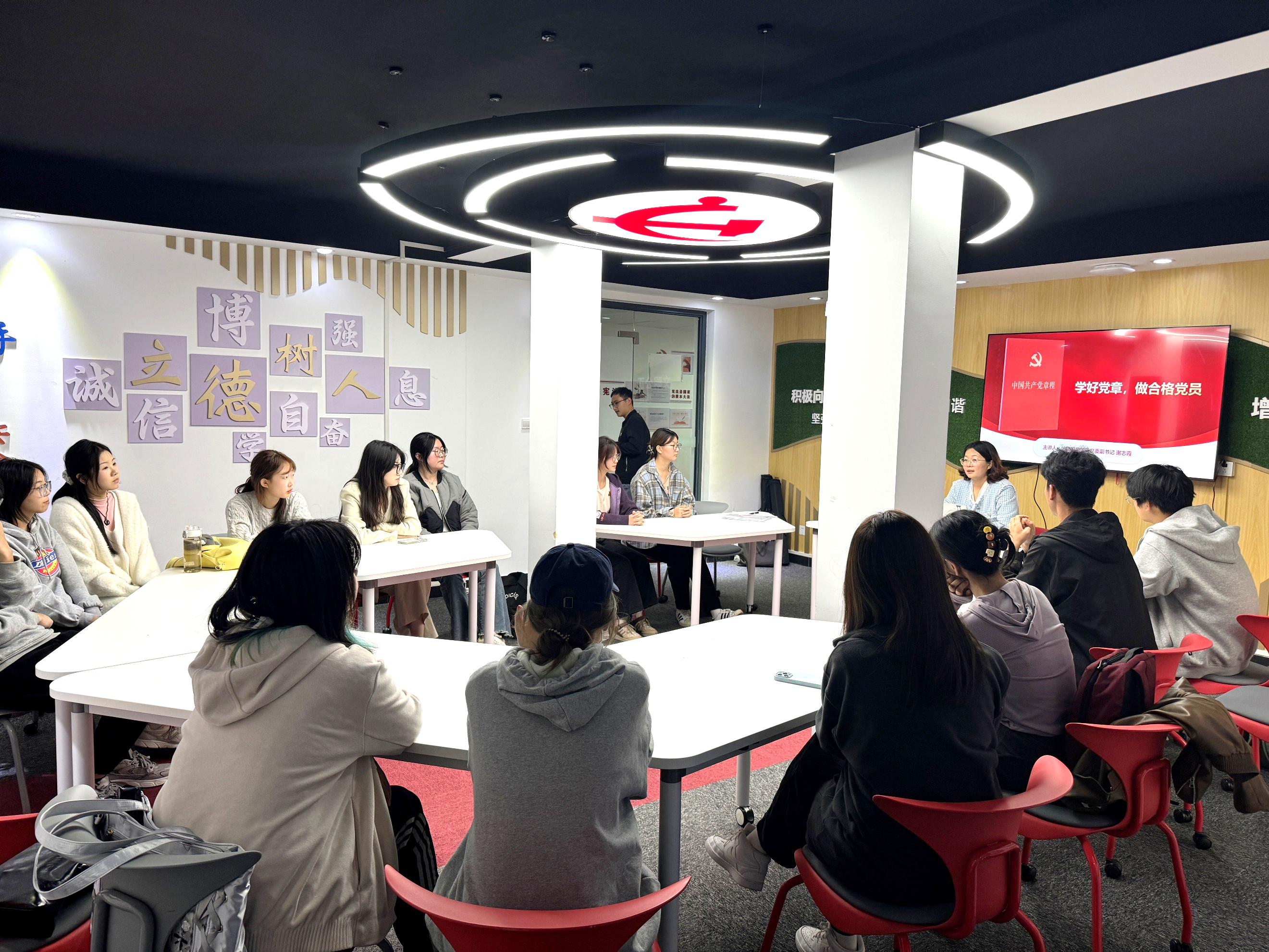 2024年10月29日,《学习党章,做合格党员》的入党启蒙讲座在一站式学生社区服务中心-红心筑梦空间举办。由学院党委副书记谢志霞主讲,党章学习小组长参会学习。