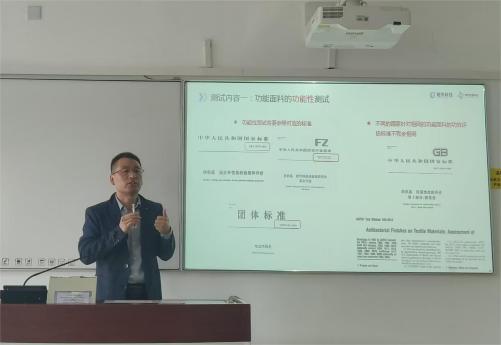 课堂上王总首先从纤维、织造、染整、后整理复合四个角度讲解了功能性材料的制备方法,对功能纺织材料的功能性和基本性能测试两个方面针对不同的标准进行了介绍,最后详细介绍了相变调温、三防功能、单向导湿/单亲单防、石墨烯电加热等新产品的开发案例。新产品结构设计的创新思维以及质量测试的严谨逻辑融汇在具体案例中,解惑的同时引导学生正确的世界观。