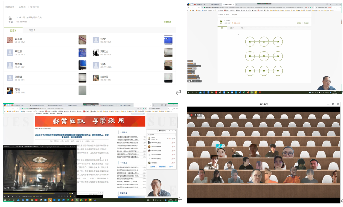 对于课前和课后2次签到采用不同的方式。课前签到为普通签到,但要求学生拍照上传,拍摄内容必须与本课程学习内容相关,以此掌握学生对于本课程学习的准备情况;课后签到则为手势签到或签到码签到,老师下课前会通过腾讯会议直播口头告知学生手势或签到码,如果学生没有按时签到,则可以证明该学生没有认真听讲、或有中途离开或网络不好等不良状况发生。此外,疫情期间,为了充分调动学生们的学习热情,增进师生感情,教师提前10-20分钟进入直播间,一是提醒学生完成学习通的签到,二是跟学生们一起分享时下流行的音乐以及浏览学校官网的新闻,以此舒缓学生对于学习和生活的焦虑心情。通过课前充分互动,学生逐渐进入学习状态并开启摄像头,开开心心迎接每一堂网课。