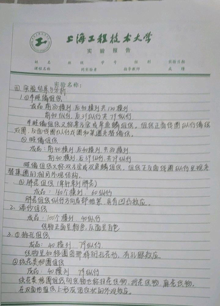 实验报告注重描述操作过程,确保实验结果与分析准确。针对实验报告中缺乏实际编织样品的问题,制定了详细的实验报告撰写要求。对于基础型实验,要求实验过程详实,包括机况检查,如何起口、编织以及落片。对于设计型实验,要求通过工艺单的方式表示实验操作过程,需提供排针数,机头停靠方向,编织转数以及编织方法。对于创新型实验则要求撰写设计思想和设计方案。而无论哪一种实验均要求对实验结果进行描述与分析,具体包括实验小样的纵行数和横列数,以及外观和特性。其中编织小样的纵行数和横列数需要与实验过程的排针数和编织次数对应,小样外观和特性则要求学生基于学习操作视频和相关专业知识进行自行分析。