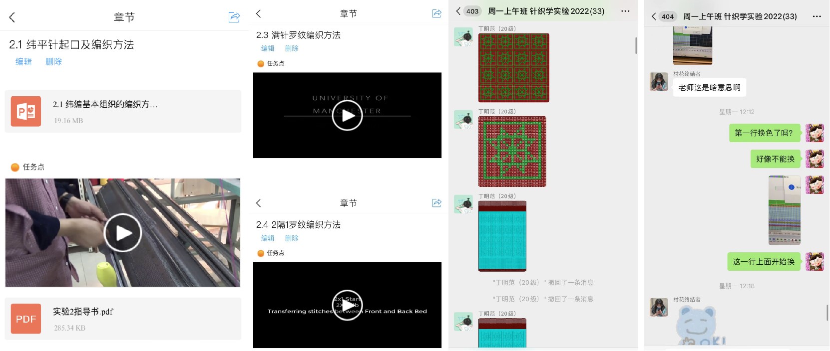 结合多种教学平台,丰富线上教学资源。教研组在学习通创建了《针织学实验》线上教学平台,利用线上平台及时分享教学课件和视频等资料。同时采用腾讯会议室,微信等交流平台进行授课以及答疑。在线上教学平台的建设过程中,教研组收集了大量的校外视频资料,视频资料来源于东华大学,英国曼彻斯特大学,香港针织协会,国内外视频网站,并根据课程需求对视频进行了选取和删减。以实验二为例,其中纬平针起口操作视频采用了教研组高伟洪老师的操作示范视频,满针罗纹起口采用了曼彻斯特大学针织学实验的操作视频,2隔1起口操作视频采用了国外视频网站下载的视频。