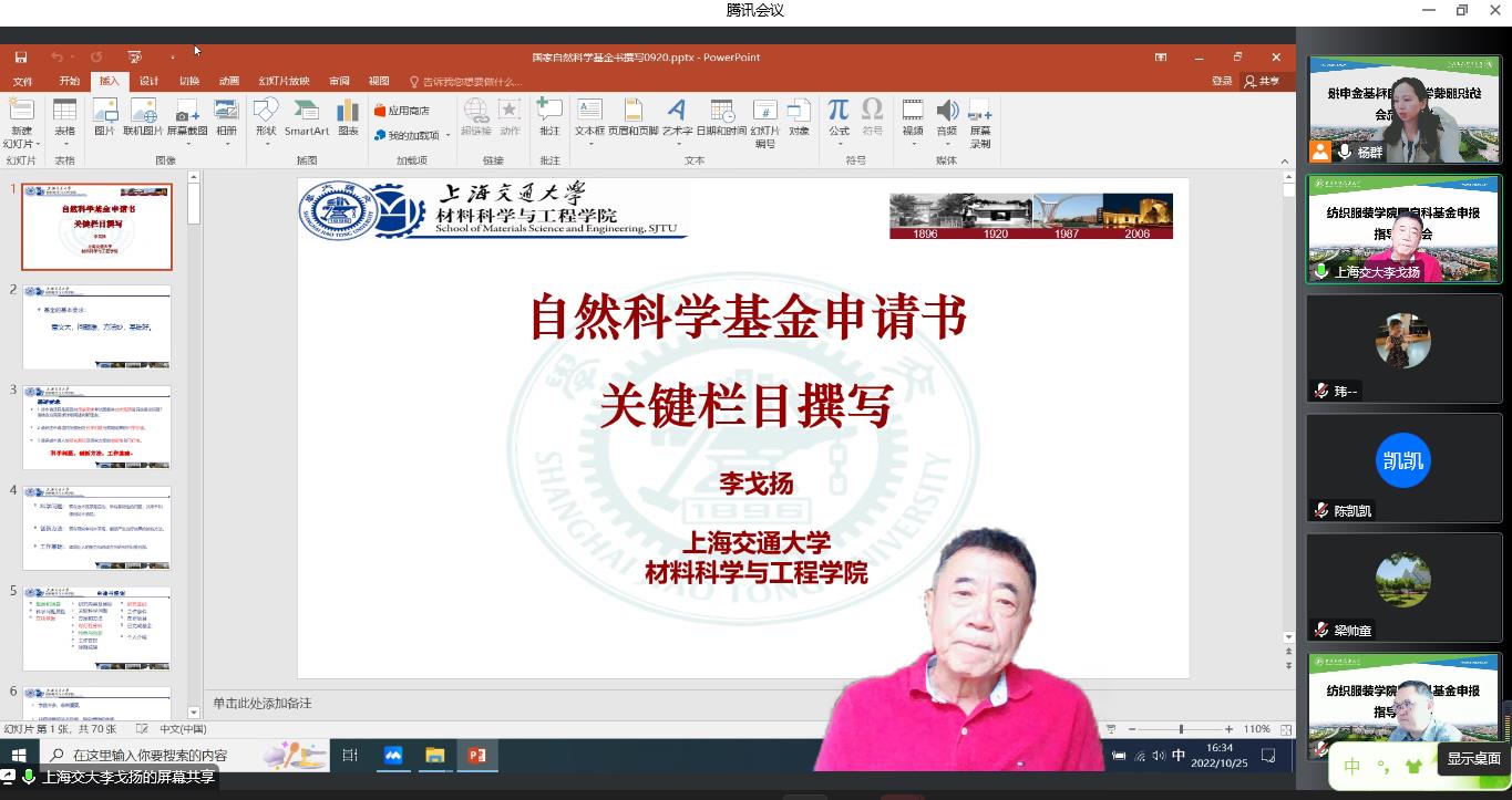 李戈扬教授,上海交通大学材料学院教授,博导,教学督导,长期从事薄膜和金属基复合材料的研究,发表高水平论文300余篇,主持完成国家自然科学基金面上项目4项,担任交大材料学院基金申请顾问,具有丰富的基金申报经验。李教授首先从国家的需求中如何提出背后的科学问题进行讲解,结合申报书提纲详细分析了题目、摘要、立项依据、可行性研究等内容撰写时的侧重点和注意事项,举例进行分析,并对国家基金申报时的思想和态度提出了建议。报告结束后,李教授与学院老师就如何明确科学问题等内容展开热烈讨论交流。