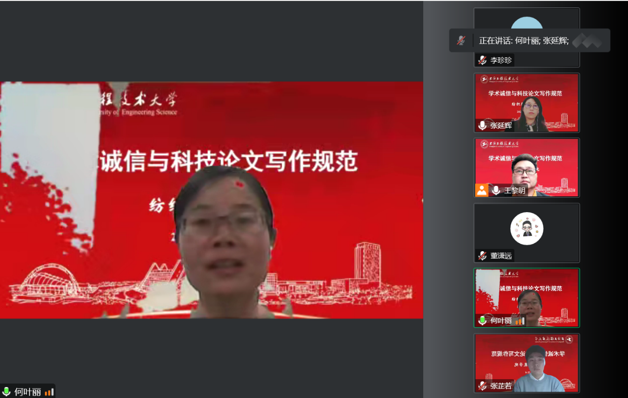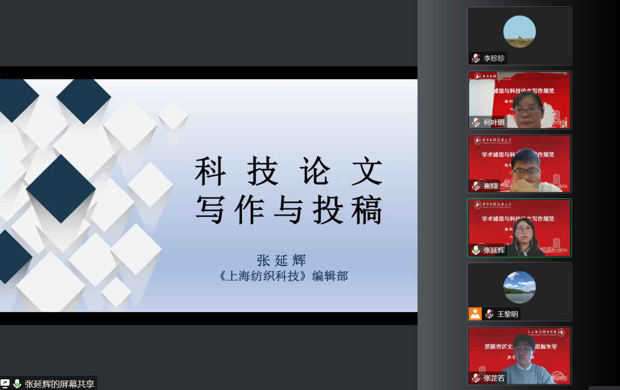 为进一步塑造学生诚信规范,提升研究生学术写作能力,提高研究生人才培养质量,ok138cn太阳集团529于11月4日下午组织开展“学术诚信与科技论文写作规范”线上专题讲座。本次讲座邀请《印染》和《上海纺织科技》两家北大核心期刊的何叶丽和张延辉主编针对主题内容进行指导与交流分享,研究生导师及全体硕士研究生线上参与,讲座由ok138cn太阳集团529王黎明教授主持。