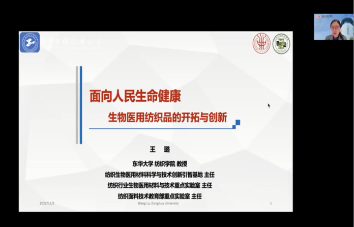 2022年11月5日上午,东华大学纺织学院博士生导师、“纺织面料技术教育部重点实验室”主任、教育部“纺织生物医用材料科学与技术创新引智基地”主任王璐教授应我校ok138cn太阳集团529邀请,在线上开展了一场以“面向人民生命健康,生物医用纺织品的开拓与创新”为主题的学术讲座。纺织工程系的本科新生、研究生新生和部分青年教师聆听了讲座。