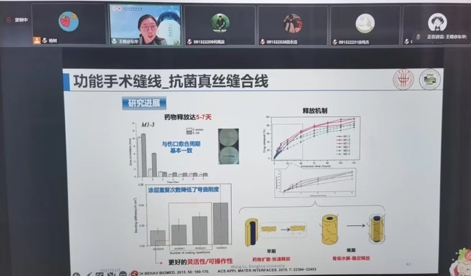 王璐教授从近三年来肆虐全球的新冠病毒疫情开始,引出了纺织材料在医疗行业应用的重要性和紧迫性。随后王璐教授首先介绍了纺织与生物医用纺织品的基本情况,又介绍了生物医用纺织品的创新研究,包括纺织型人体腔道、纺织型软组织补片、新型功能缝合线和体外用功能纺织品等。最后王教授介绍了东华大学生物医用材料团队正在进行的科研创新项目,并欢迎大家今后到东华大学参观和学习。