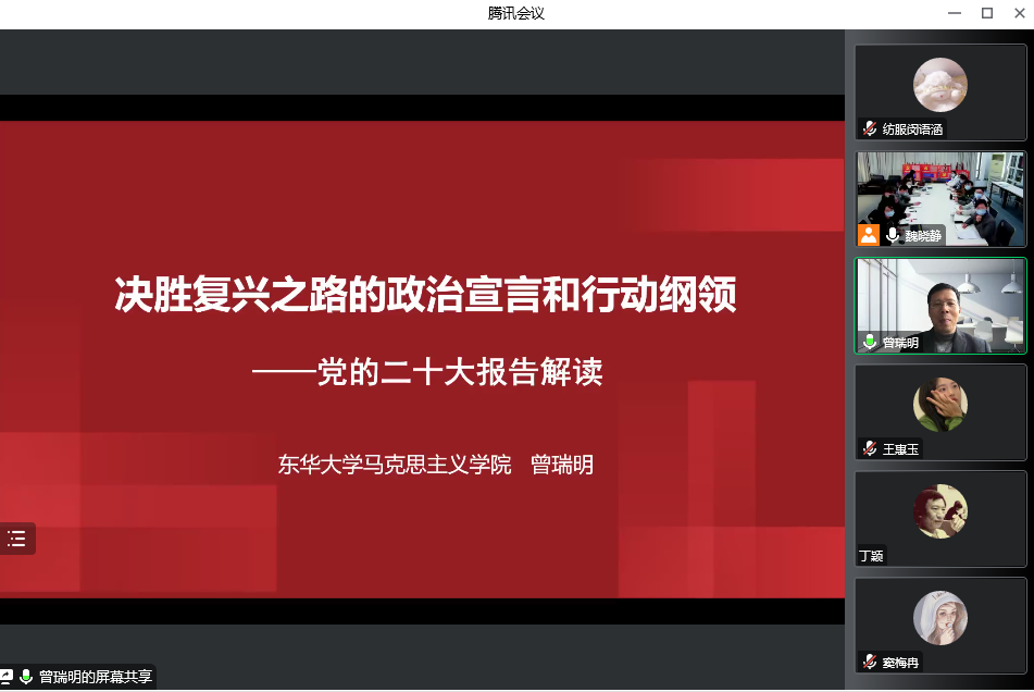 为贯彻落实《中共中央关于认真学习宣传贯彻党的二十大精神的决定》,切实引导广大党员师生学习、宣传和贯彻党的二十大精神,12月1日下午1点,ok138cn太阳集团529党委邀请东华大学马克思主义学院教授、上海市形势政策教育研究会副会长曾瑞明以“决胜复兴之路的政治宣言与行动纲领——党的二十大报告解读”为主题为学院党员师生作专题辅导报告。学院党政领导班子、党支部书记、系室主任、部分师生党员以及党章学习小组长以线上线下相结合的方式共同参加学习。报告会由学院党委书记朱君璇主持。