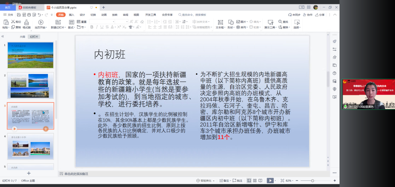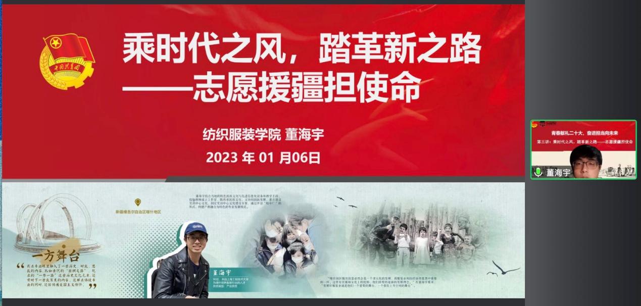 第三讲“乘时代之风,踏革新之路一一志愿援疆担使命”课程邀请到了学院“90后”援疆干部、服装设计与工程专业教师董海宇老师以及服装设计工程专业维吾尔族学生哈丽美热·阿布力孜介绍了学院援疆情况、自身援疆经历感受、受到援疆帮助的当地同学的真实感受等,结合习近平总书记对广大青年的殷切寄语,希望我们能够在新时代争做新青年,将入党、跟随党组织的脚步作为人生的理想目标,不负时代、不负人民、不负我们的青春好时光!