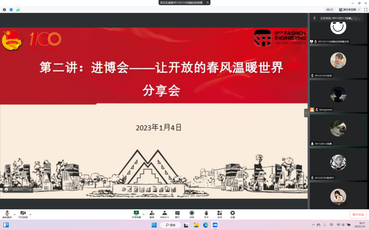 第二讲“进博会——让开放的春风温暖世界”分享会邀请了服装设计与工程专业20级的苏宇彤、张鹂两位参加本次进博会志愿服务的同学进行志愿经历分享。两位同学从从进口博览会的具体培训流程到参加活动时面对的具体事宜做出分享感悟:不仅仅开拓了眼界,从中获得了对工作的流程安排等事务的经验教训,不断反思从而提高自己的能力;还结交到了许多同学朋友,使自己的生活变动饱满丰富起来。参与活动时所处在的团队包容且开放,对自己的帮助和启发是很大的,所以活动工作虽累但快乐。并鼓励同学们积极参与志愿服务,展示青年风貌,体现担当作为。