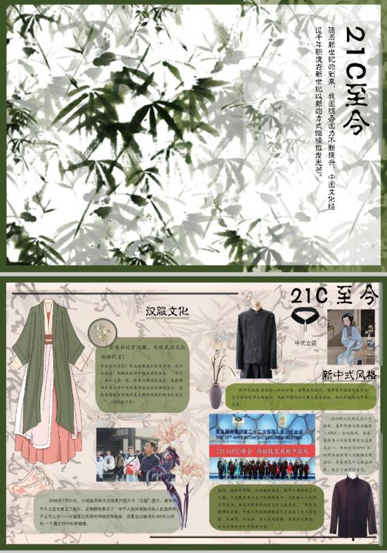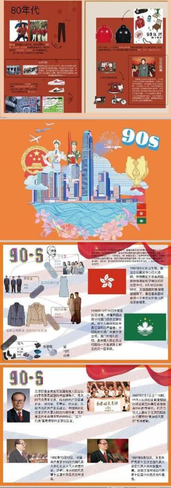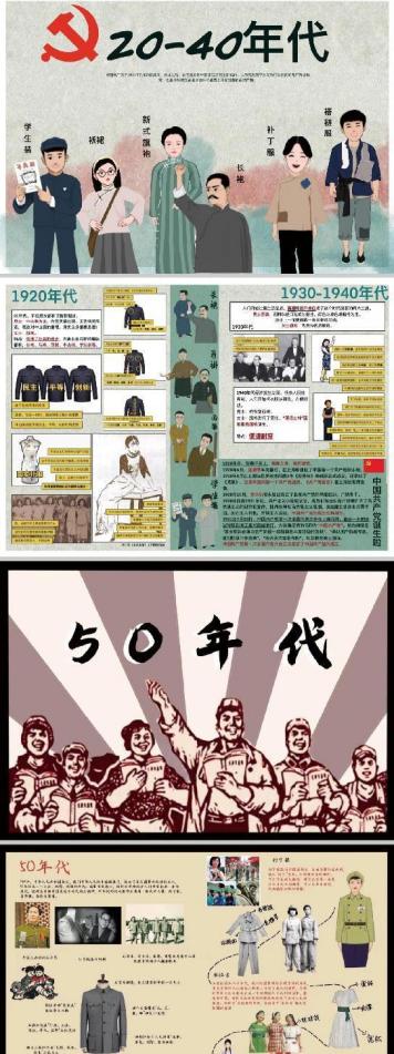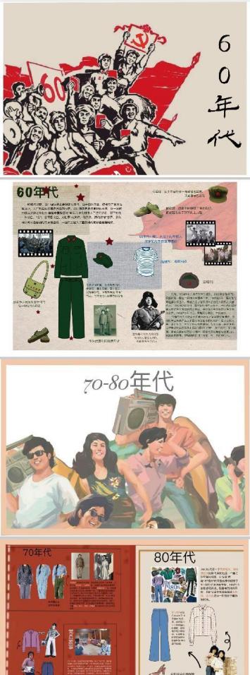 此手册以“服饰变迁”这一切入点来展现不同时代的社会风貌,讲述党员故事,见证党史和祖国的发展。一件件闪烁着时代样貌的衣服仿佛在诉说着一个个镌刻历史的社会变化,描绘着一件件振奋人心的国家大事,讲演着段段生动感人的党史故事。整本册子分为六个时代篇章,也是从20年代建党开始至今的六段服饰变迁。从20-40年代的袄裙、改良旗袍、长袍、马褂、学生装,到50年代流行的新式中山装、列宁装等,到60年代的绿军装、海魂衫、雷锋帽等蓝灰绿的审美时潮,到70、80年代的复古港风,更与国际接轨,再到90年代大胆的设计风格,最后到如今的新中式。同学们在设计的过程中从服饰变迁看时代变迁,回望建党百年来的历史;深刻体会到每一种类型的服饰都见证着一代人的“独家记忆”,铭刻着每一时代书写的峥嵘篇章;进一步夯实文化自信的基础。