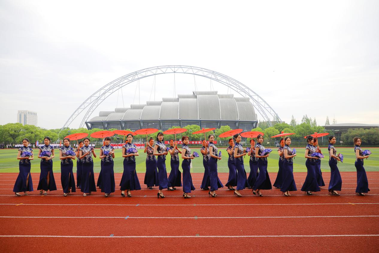开幕式上,旗袍队表演者们在清越柔美的音乐中,身着青蓝色花卉旗袍,以饱满的热情、优雅的仪态、轻盈的步伐尽展东方女性的含蓄优雅和旗袍的独特魅力。红伞传情、折扇传思,踏出江南风韵,走出沪上风采。整个表演,散发出浓浓的东方风情,展现新时代工程大女性的自信与风采,展现新时代海派文化之美,展现中国服饰“文化自信”符号。这也是新时代工程大女性生动写照。热爱工作、热爱生活,成为新时代美丽校园、美丽中国的参与者和建设者。