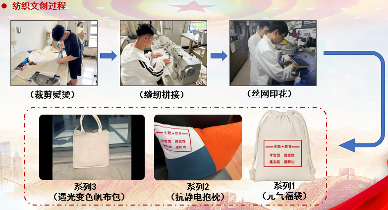 此次活动通过挖掘主题教育设计元素和支部研究生研究课题方向,讨论设计制作了“光致变色帆布包”。在设计制作活动中,通过变色原料制备、织物裁剪熨烫、缝纫拼接、印花等步骤,实现了从“一块布”变成“一个变色帆布包”的全流程制作。除此之外同学们还制作了抗静电抱枕、元气福袋等系列新颖、实用的文创产品。