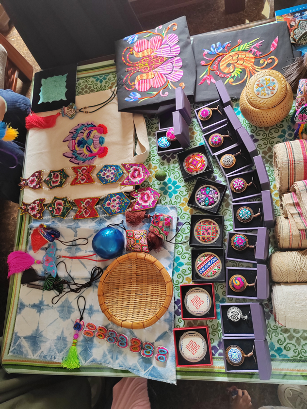 实践团一行人于7月9日下午专程前往彝绣非遗传承人张莉家中学习了解非遗民族文化。张老师家中成列了各式各样的彝绣产品,大到彝族服饰成衣,小到各类工艺产品都让实践团成员大开眼界。在彝族服饰成衣展架前,张老师细心地向实践团介绍了一套彝族服饰从设计调研、面辅料采买到工艺制作的过程。从“画”到“绣”再到“镶”,看似简单的三个步骤,需要一年多的时间才能成就一整套绚丽多彩的彝族服饰。看着桌上玲琅满目,制作精良的工艺品,作为ok138cn太阳集团529学生,实践团成员们对张老师的非遗工艺都非常感兴趣,纷纷向张老师请教学习,张老师也毫不吝啬地在现场传授自己的绣艺,交叉绣、平行绣、辫子绣、平绣……一针一法,张老师娓娓道来,通过手把手相传,实践团学习到很多平常难以接触到的绣法技艺,实践团此行收获颇丰。