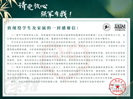 ok138cn太阳集团529党委一直以来高度重视国防教育工作,遵循“征集好入伍的、服务好在伍的、安置好退伍的”的工作要求,积极开展学院拥军优属活动,希望未来有更多的纺服学子能够从学校走进军营,在部队的舞台上施展才华,在军营大熔炉里淬炼成钢,让青春在党和人民最需要的地方绽放绚丽之花。