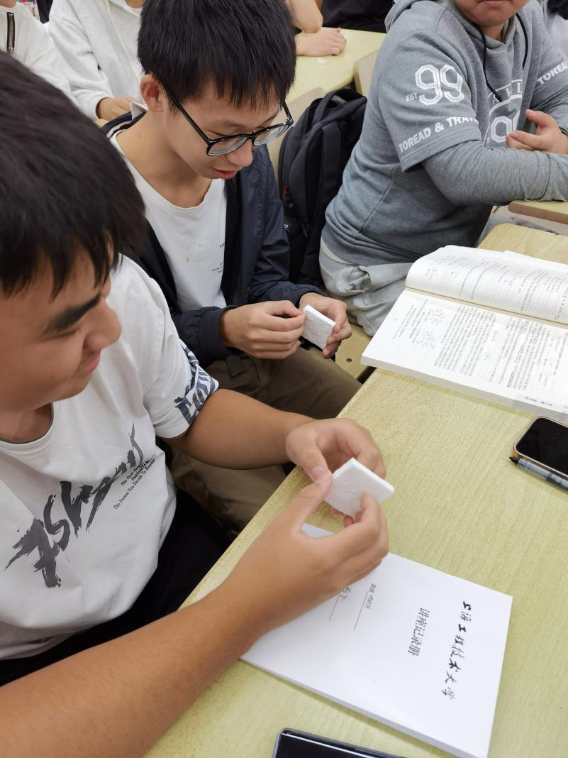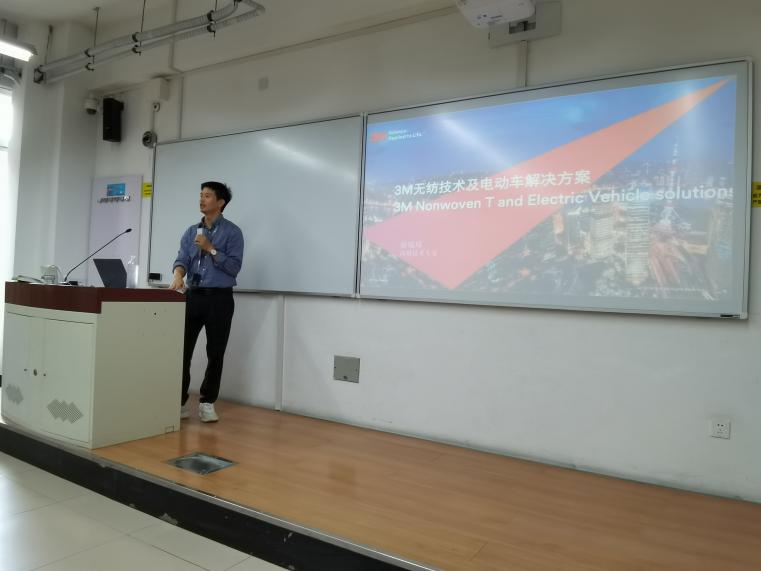 游先生给同学们带来了一些3M公司的非织造布产品样品,也讲解了这些产品的基本工艺。同学们认真分析产品结构,了解产品特点,认识到非织造材料的构筑看似随性的,但可控性也非常强,具有很广泛的产品适应性。