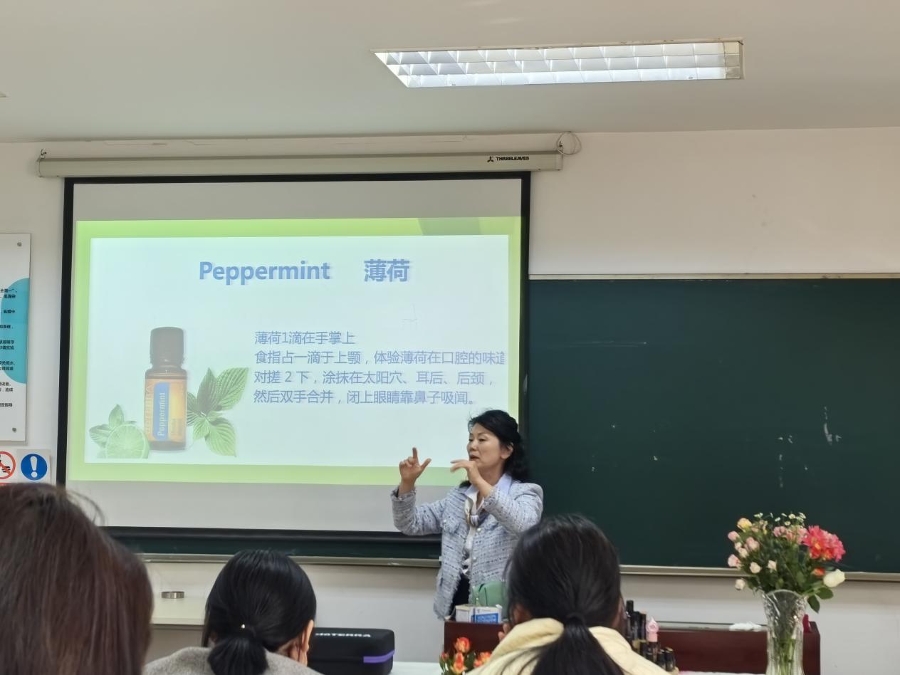 活动现场,老师们先从专业角度给大家普及了一下精油相关的知识和文化起源,并介绍了精油的使用方法及注意事项。在场的女教师们在老师指导下将精油滴入手掌心,利用手心温度加热按摩,然后在老师的指引下尝试了芳香冥想体验,充分感受精油的美好。随后老师又示范了精油肩颈护理手法,在场的老师们充分感受到了植物芳香疗法的魅力,在精油的美好氛围中,在场的女教师们身、心、灵都得到了健康和平衡。