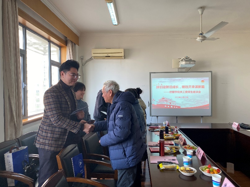 朱君璇书记回顾了2023年学院关工委工作,对各位关工委老同志的付出表示感谢。同时为了更好地丰富学院关工委品牌建设内涵,壮大学院全方位思政教育合力,打造课程思政建设共同体,学院党委特成立“五老”思政宣讲团,会上孙文钧、朱君璇为拟聘宣讲员黄海成、黄勤奋、周静、孙荪四位关工委老同志颁发聘书,希望关工委老同志们能够充分发挥政治、经验和威望优势,向学生传递正能量,宣扬思政好声音,引导学生成长成才。